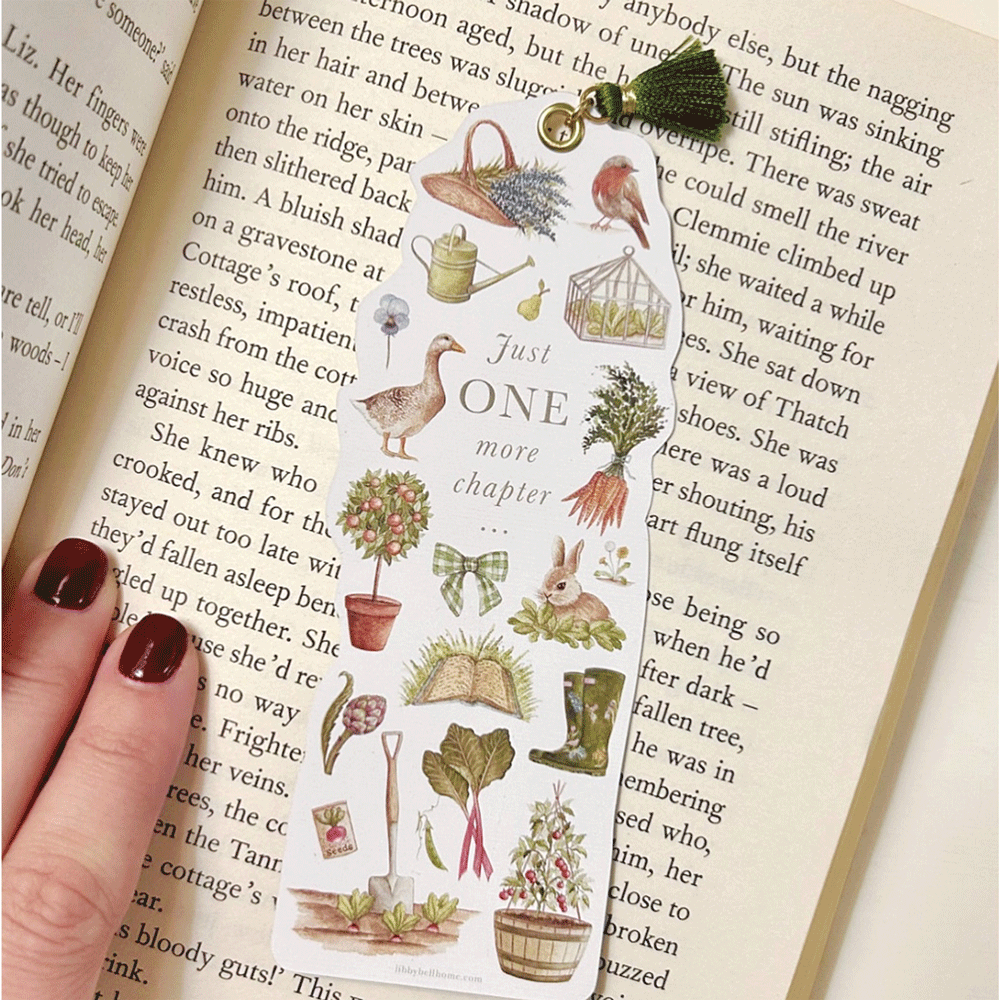 Mark your place with a touch of garden charm. This adorable veggie patch bookmark features Libby's cheerful illustrations of bunches of carrots, tomato planters, watering cans, flowery gumboots and other veg garden favourites.